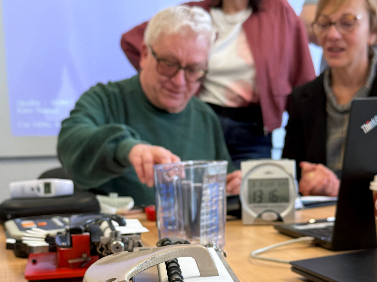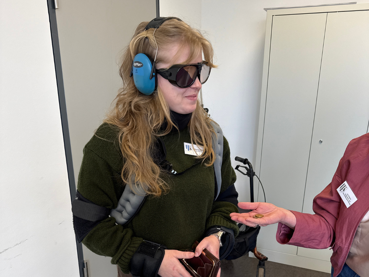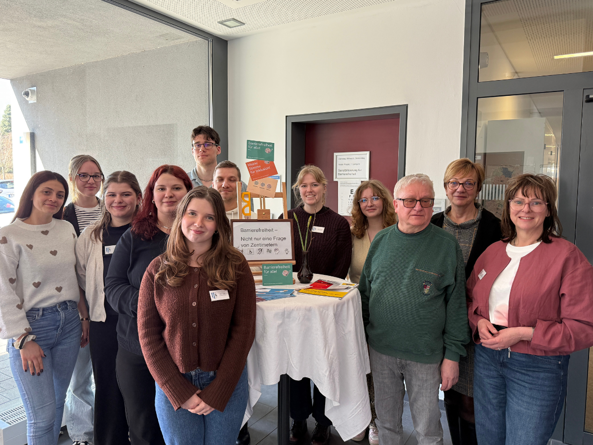 Um den Nachwuchskräften einen Eindruck vom Alltag einer beeinträchtigten Person zu vermitteln, berichtete Harald Weber vom Blinden- und Sehbehindertenverband Sachsen-Anhalt e.V. über seine täglichen Herausforderungen als blinde Person. Er zeigte den Azubis wie die Brailleschrift konzipiert ist, präsentierte Alltagsgegenstände, die auf den Tast- und Hörsinn optimiert sind sowie spezielle Apps, die über die Sprachausgabe detailliert Fotos beschreiben oder Beiträge vorlesen. Zusammen mit Experten von der Hochschule Magdeburg-Stendal wechselten die Jugendlichen dann die Perspektive und konnten mittels Rollstuhls, Gehhilfen und blickdichter Maske selber nachempfinden, wie sich der Alltag für beeinträchtigte Personen anfühlt. Auch der Alterssimulationsanzug kam zum Einsatz, mit dem sich die Eintrübung der Augenlinsen, Schwerhörigkeit und Gelenkversteifung nachstellen lassen.