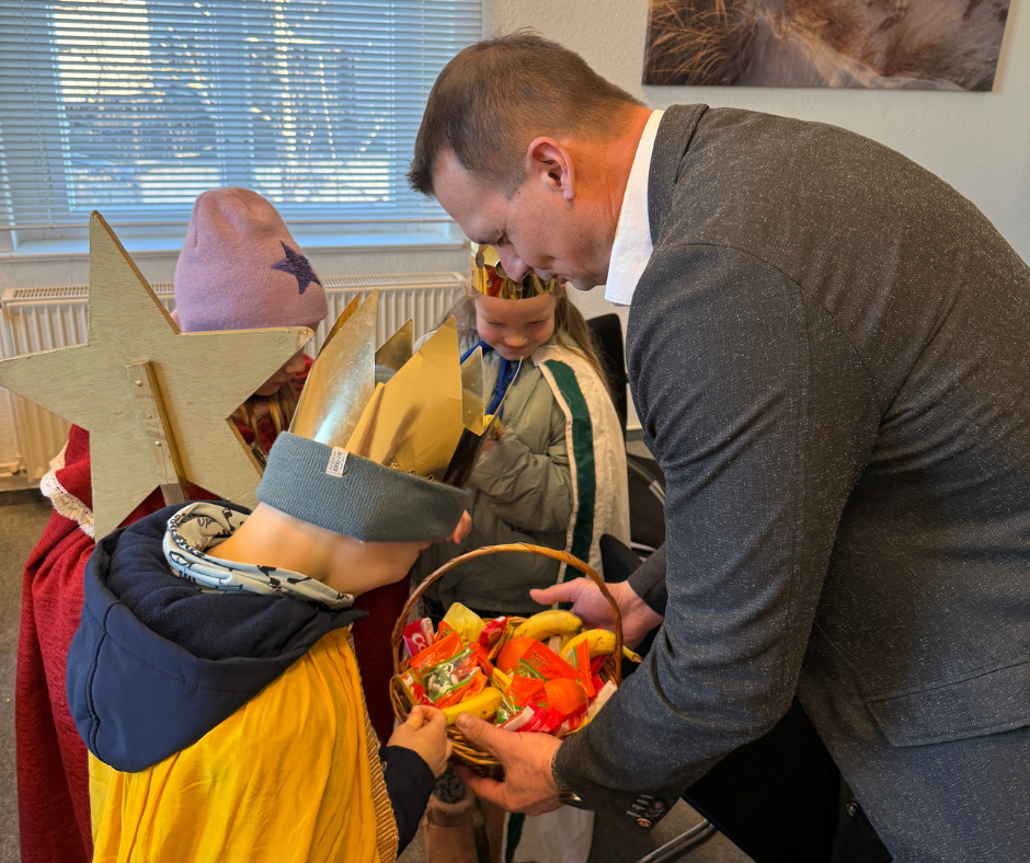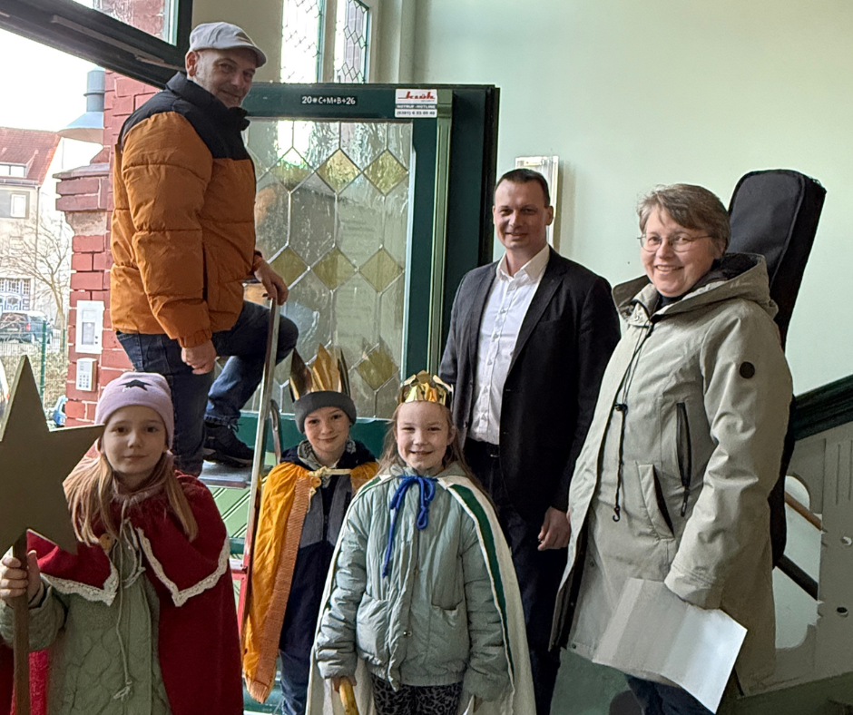 Am Donnerstag, 15. Januar 2026 waren die Sternsinger der katholischen Parrei St. Johannes im Landratsamt zu Gast und überbrachten musikalisch untermalt den traditionellen Neujahrs-Segen. Beigeordneter Stefan Dreßler bedankte sich für den Besuch und unterstützte die diesjährige Spendenaktion, die unter dem Motto „Schule statt Fabrik – Sternsingen gegen Kinderarbeit“ steht, mit einer Spende und überreichte den Sternsingern kleine Präsente.