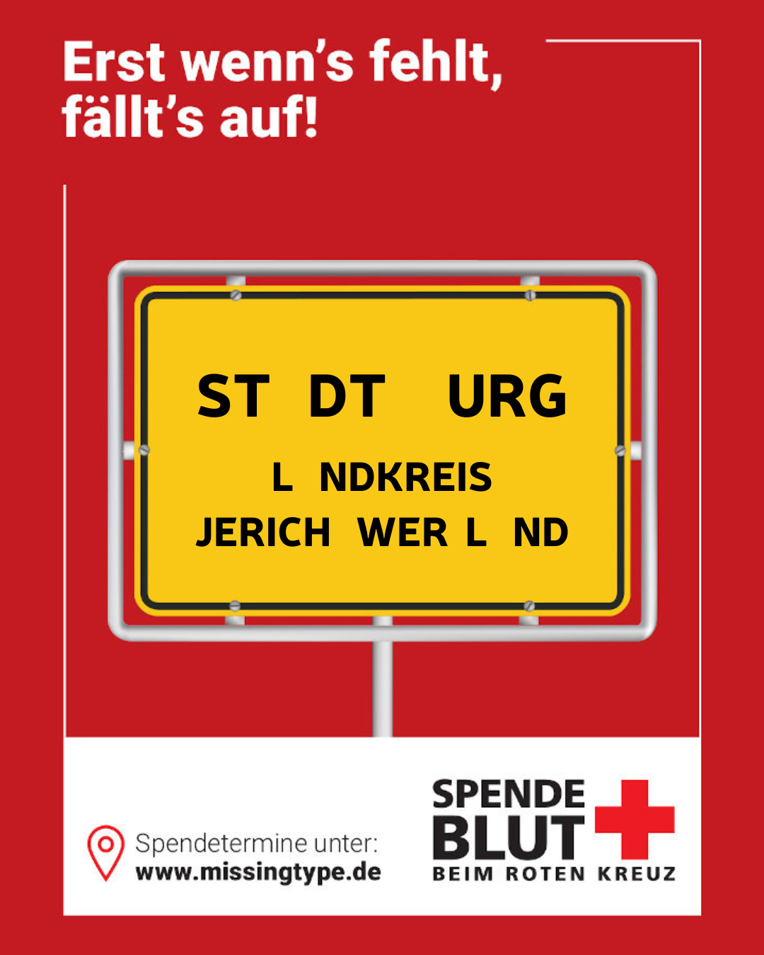 L NDKREIS JERICH WER L ND - KREISST DT URG - Hier fehlt etwas sehr Wichtiges: das A, das B und das O. Mit dieser bundesweit angelegten Kampagne #missingtyp "Erst wenn's fehlt, fällt's auf" machen die Blutspendedienste des Deutschen Roten Kreuzes (DRK) auf die dringende Notwendigkeit von Blutspenden aufmerksam.