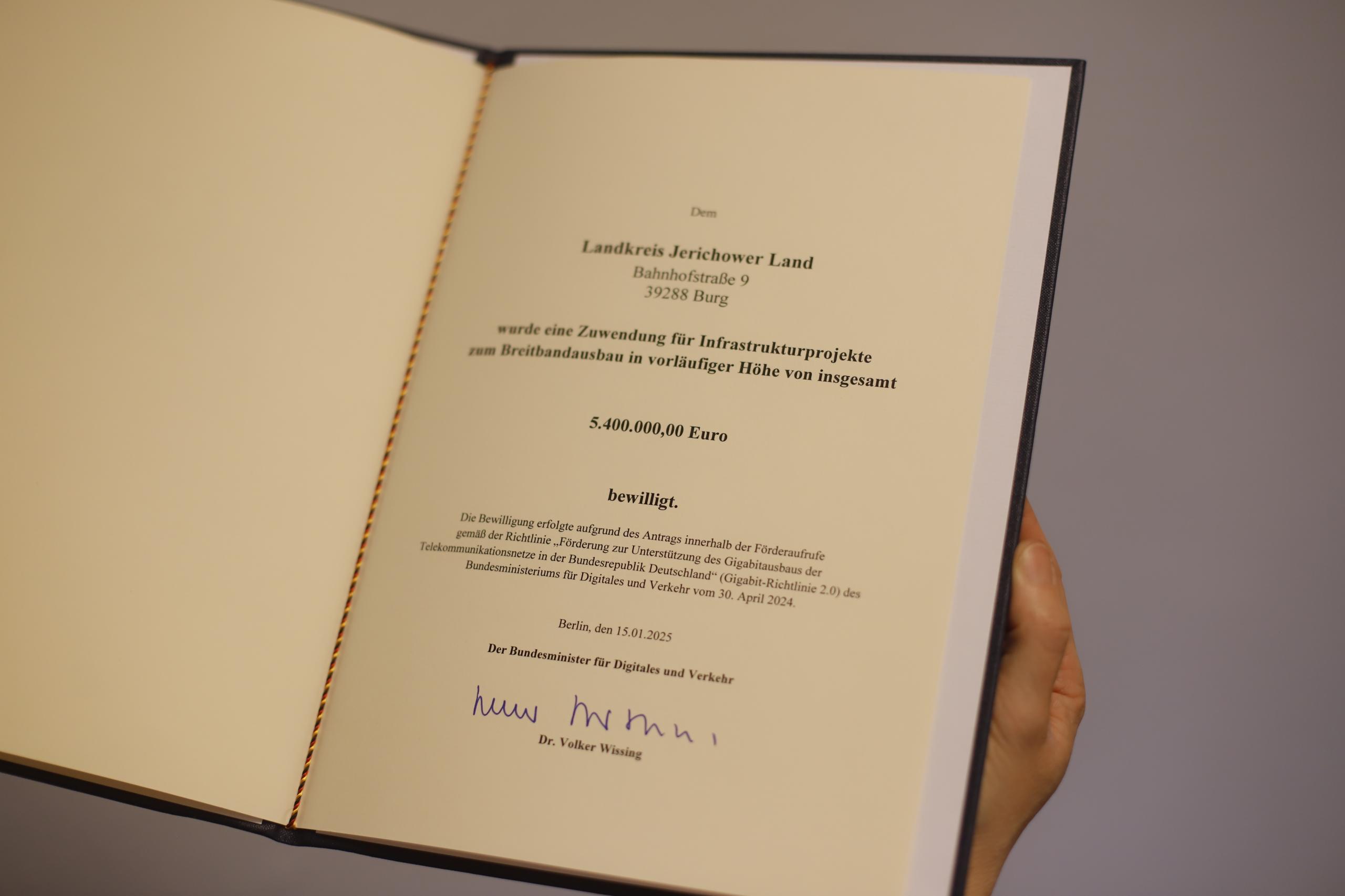 Am Mittwoch, 15. Januar 2025 nahmen Landrat Dr. Steffen Burchhardt und Beigeordneter Stefan Dreßler im Bundesministerium für Digitales und Verkehr in Berlin aus den Händen von Bundesverkehrsminister Dr. Volker Wissing einen Förderbescheid im Rahmen der Gigabitförderung 2.0 in Höhe von 5,4 Millionen Euro für den Ausbau des Breitbandnetzes im Kreisgebiet entgegen. Ziel des auch als „Graue Flecken“ bekannten Programmes ist die Versorgung aller Haushalte mit einer Geschwindigkeit von mindestens 200 Mbit/s symmetrisch bzw. 500 Mbit/s im Downloadbereich. Durch die Kombination der Förderprogramme von Bund und Land sowie einer Unterstützung durch das Land Sachsen-Anhalt wird eine Förderquote von 100 Prozent erreicht, so dass die Maßnahme ohne Mehrkosten für die Kreisverwaltung umgesetzt werden kann.