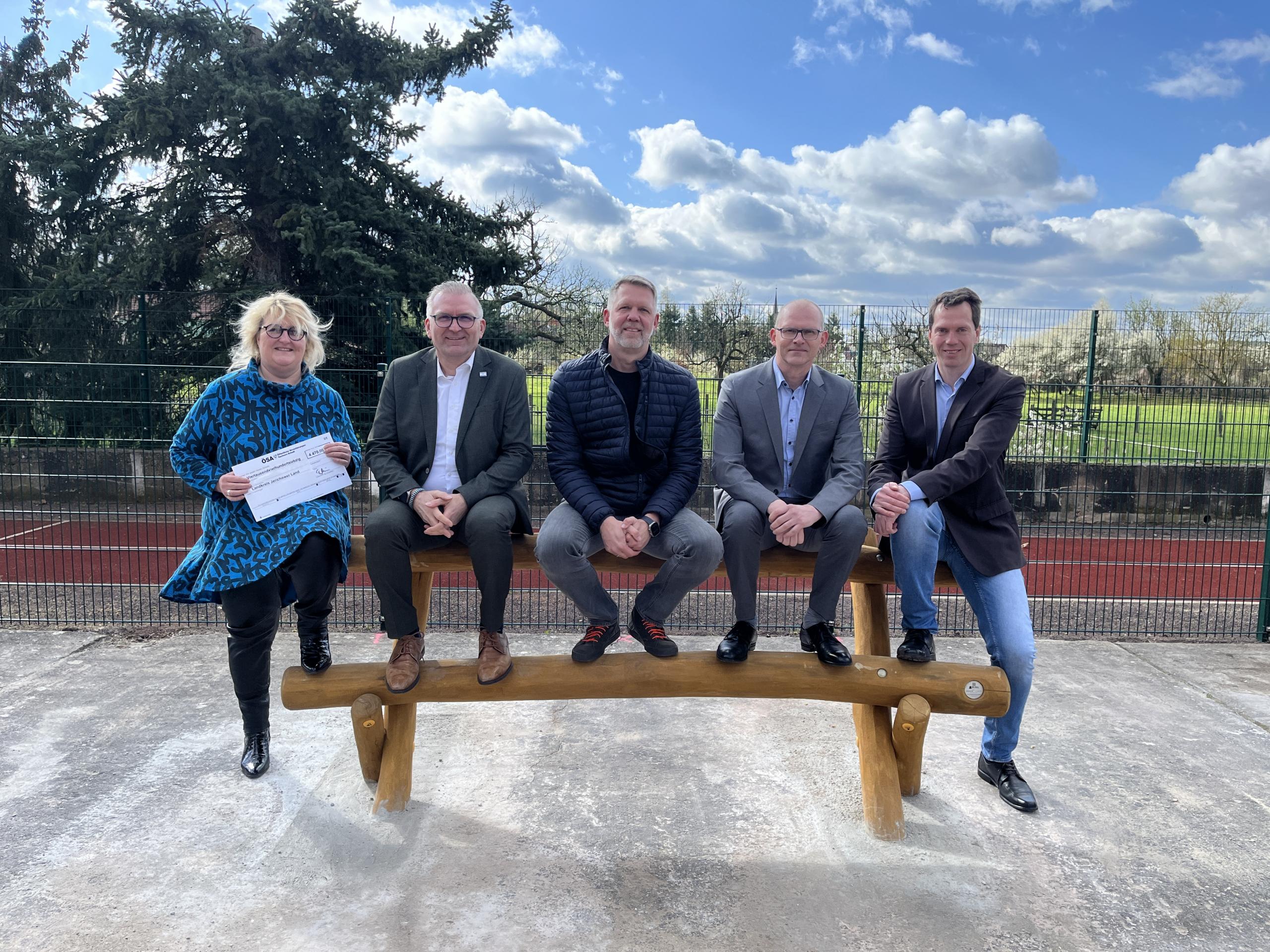Über neue Sitzmöglichkeiten dürfen sich die Schülerinnen und Schüler der Förderschule „Albrecht Dürer“ in Parchen freuen. Gemeinsam mit Frank Meyer, Torsten Hirschmann und Andreas Zimmer von den Öffentlichen Versicherungen Sachsen-Anhalt (ÖSA) übergab Landrat Dr. Steffen Burchhardt heute drei Lümmelbänke im Wert von 4.470 Euro für den Schulhof.