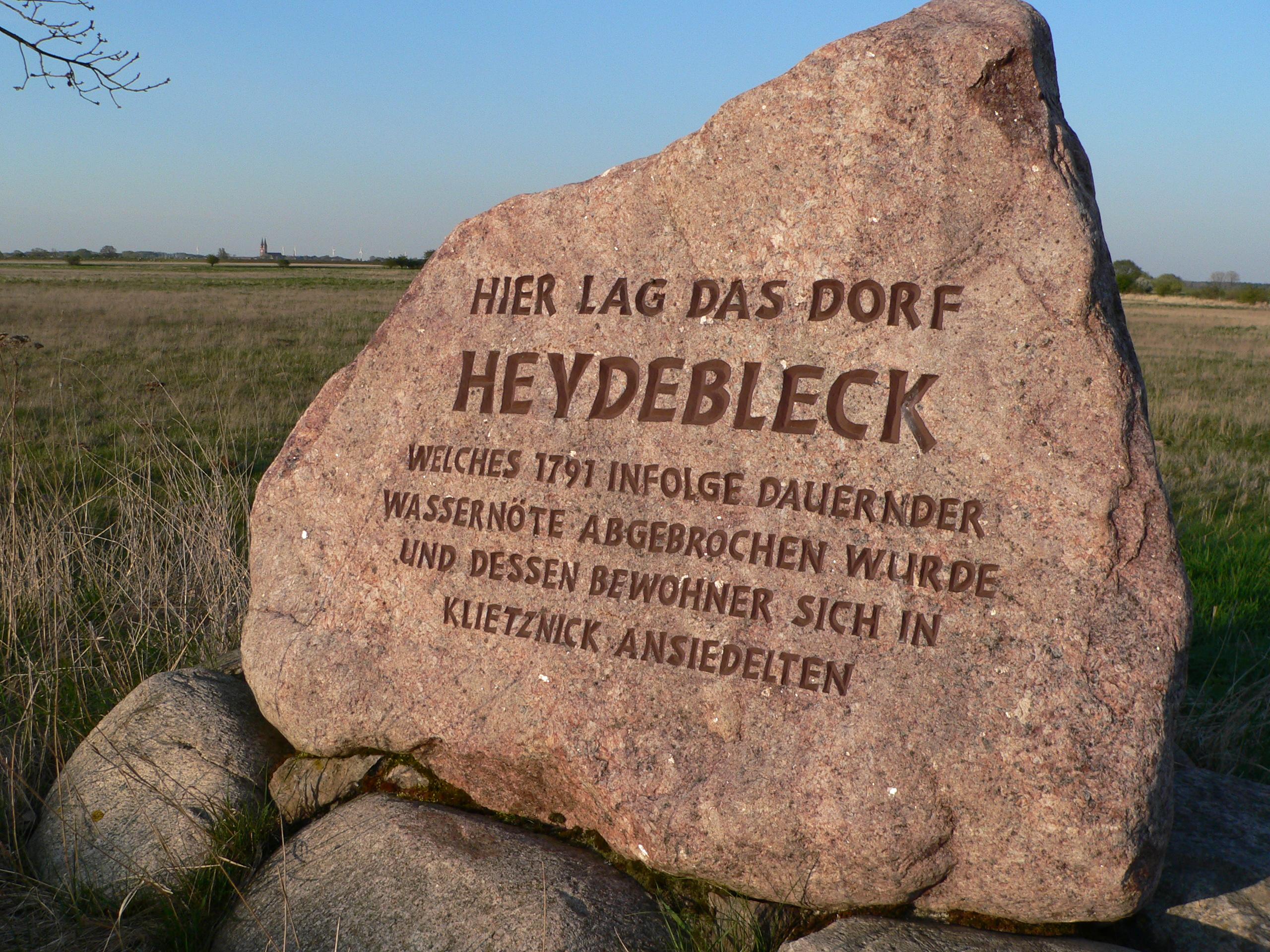 Im Bucher Brack nahe der Elbe steht der Gedenkstein des versunkenden Dorfes Heydebleck. Dieser erinnert mit der Inschrift an das im Jahr 1791, in welchem das Dorf durch Hochwasser aufgegeben wurde und dessen Bewohner sich in Klietznick ansiedelten.