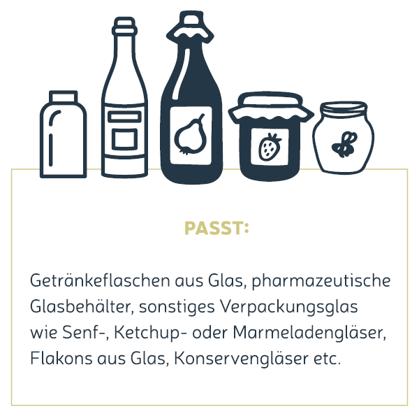 Glas ist zu 100 % ohne Qualitätsverlust wiederverwertbar und kann in Form von Recyclingglas beliebig oft zu hochwertigen neuen Glasverpackungen verarbeitet werden.