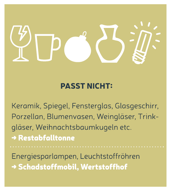 Jährlich werden in Deutschland rund zwei Millionen Tonnen Recyclingglas gesammelt. Durch das Recyceln einer einzigen Flasche kann ein Rechner 25 Minuten, ein Fernseher 20 Minuten oder eine Waschmaschine 10 Minuten lang mit Strom versorgt werden.