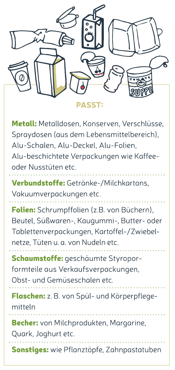 Leichtverpackungen sind über die Gelbe Tonne zu entsorgen. Dazu gehören Kunststoffe, Metalle wie Aluminium oder Weißblech und Verbundstoffe.