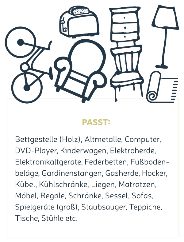 Sperrmüll sind Abfälle, die aufgrund ihrer Form und Größe, ihres Gewichts oder der Materialbeschaffenheit nicht über die gestellten Abfalltonnen entsorgt werden können.