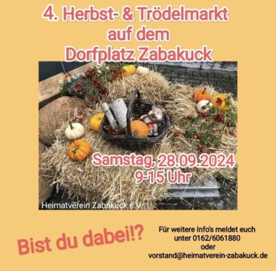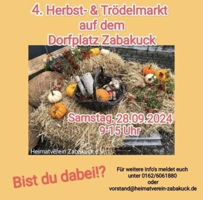 Am Samstag, den 28. September 2024, findet von 9:00 bis 15:00 Uhr der 4. Herbst- und Trödelmarkt auf dem Dorfplatz in Zabakuck statt! Der Heimatverein Zabakuck e.V. lädt alle herzlich ein, durch herbstliche Stände zu stöbern, Trödel zu kaufen und zu verkaufen. Für weitere Infos könnt ihr euch unter 0162/6061880 oder per E-Mail an vorstand@heimatverein-zabakuck.de melden.