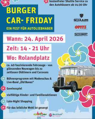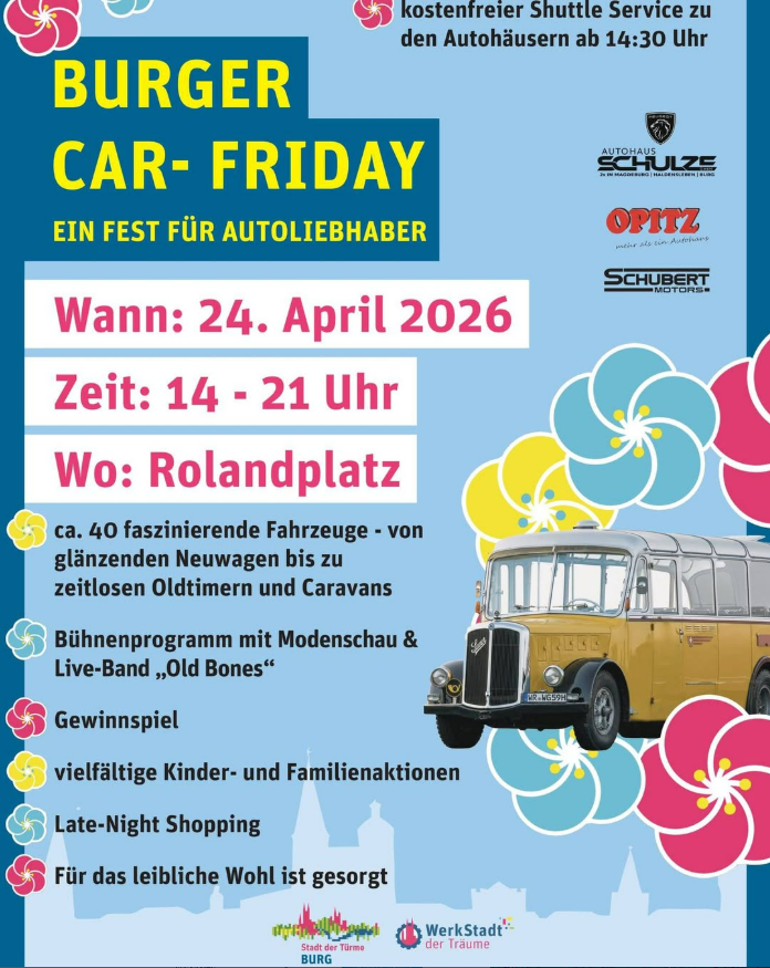 Am 24. April 2026 lädt die Stadt Burg alle Bürgerinnen und Bürger zum „Burger Car-Friday“ in die Innenstadt ein. Die Veranstaltung ist eine Weiterentwicklung des bisherigen Autofrühlings und findet von 14:00 bis 21:00 Uhr statt. Mit dem angepassten Format wird das Angebot neu organisiert und räumlich gebündelt. Zentraler Veranstaltungsort ist der Rolandplatz, der als Ausgangspunkt für das Veranstaltungsgeschehen und als Verbindung zur Innenstadt dient. Dort präsentieren regionale Autohäuser rund 40 Fahrzeuge – von Neuwagen über Oldtimer bis hin zu Caravans. Die Autohäuser Opitz und Schubert-Motors in der Magdeburger Chaussee sowie das Autohaus Schulz in der Koloniestraße sind ab 14:30 Uhr über einen kostenlosen Shuttle-Service mit einem historischen Bus der Wernigeröder Schlösserbahn erreichbar.